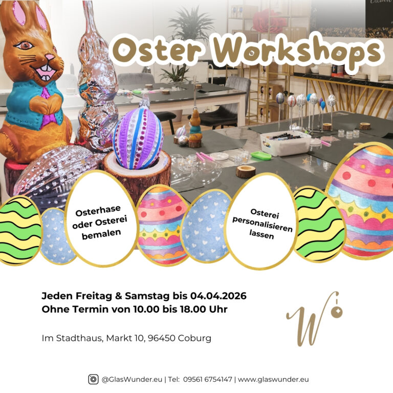 Offene Osterworkshops bei GlasWunder – Kreativ in den Frühling starten Ostern steht vor der Tür – und bei GlasWunder wird es bunt, funkelnd und kreativ! In unseren offenen Osterworkshops kannst du ganz entspannt vorbeikommen und dein eigenes Glas-Unikat gestalten. Egal ob alleine, mit Freund:innen oder der ganzen Familie: Hier entstehen