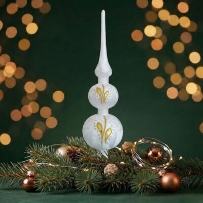 Diese abschließende Spitze aus Glas ist 31cm groß. Sie leuchtet in einem mattes Frost-Design auf mit einer filigranen, matten goldenen Glitter Linie die die Bäuche umspielt und von glänzenden goldenen Tropfen begleitet werden. -