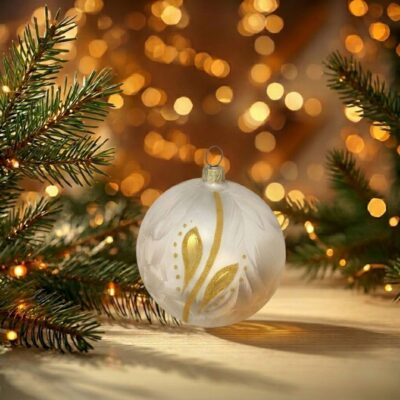 Dieses Set besteht aus 3 Kugeln á 8cm. Die Weihnachtskugel zeigt ein edles, weiß-mattes Icing-Frost-Design, das an filigrane Winterverzierungen erinnert. Matte goldene Linien umspielen das Design und schaffen einen harmonischen Rahmen. Glänzende goldene Tropfen setzen funkelnde Highlights und verleihen der Kugel eine luxuriöse, festliche Note. -