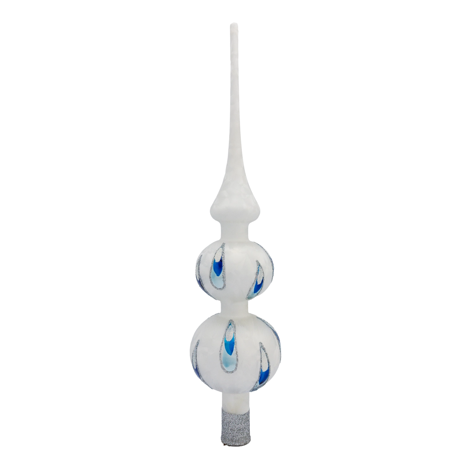 Diese krönende Spitze aus Glas ist 31cm groß. Sie funkelt in einem zarten Weißton mit einem kunstvoll gearbeiteten Icing-Frost-Design. Ihre Glasbäuche fallen durch Ihre glänzenden, blauen Tropfen besonders auf. Ein echter Hingucker!