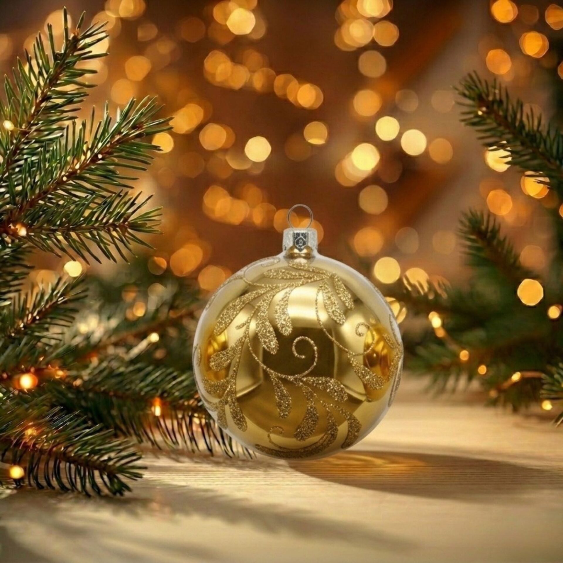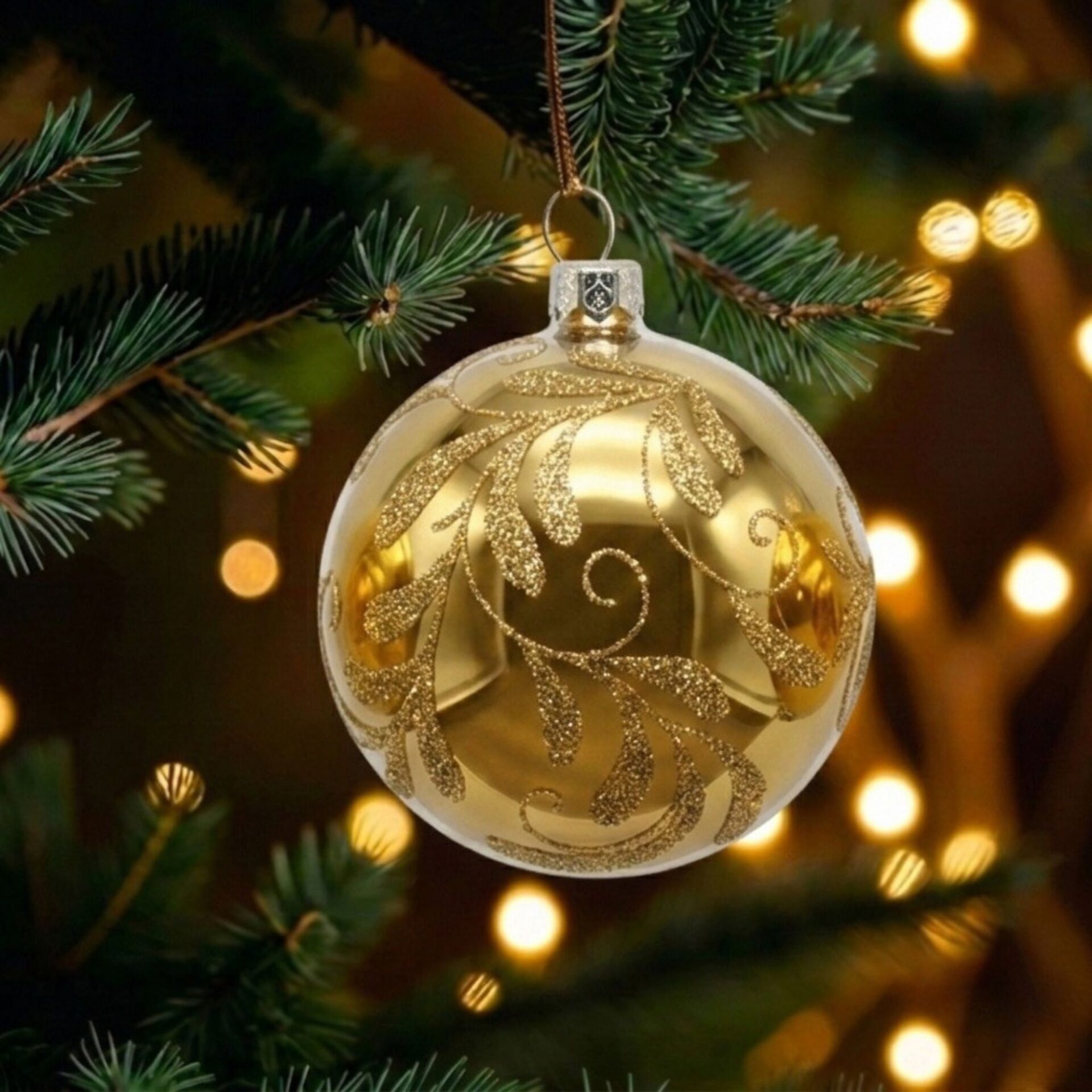 Diese festliche Weihnachtskugel vereint Eleganz und feinen Glanz. Ihr edler, matt schimmernder Goldton verleiht ihr eine zeitlose Ausstrahlung und sorgt für ein warmes, harmonisches Lichtspiel am Weihnachtsbaum. Von Hand aufgetragene Ranken aus goldenem Glitter schmücken die Oberfläche und bringen die Kugel zum Strahlen. Das filigrane Ornament unterstreicht die luxuriöse Wirkung und macht jedes Stück zu einem tollen Einzelstück. Ob als edler Blickfang im festlich geschmückten Tannenbaum oder als Teil einer stilvollen Tischdekoration – diese Kugel verleiht jeder Weihnachtsdekoration ein Hauch von Glamour und klassischer Schönheit. Unser Set besteht aus 3 mundgeblasenen Kugeln aus Glas. Sie sind 8 cm groß, von Hand verziert und in Deutschland hergestellt. Durch ihre hochwertige Verarbeitung sind sie besonders langlebig und Pflegeleicht. Unsere Weihnachtskugeln sind nur für den Gebrauch im Innenbereich vorgesehen.
