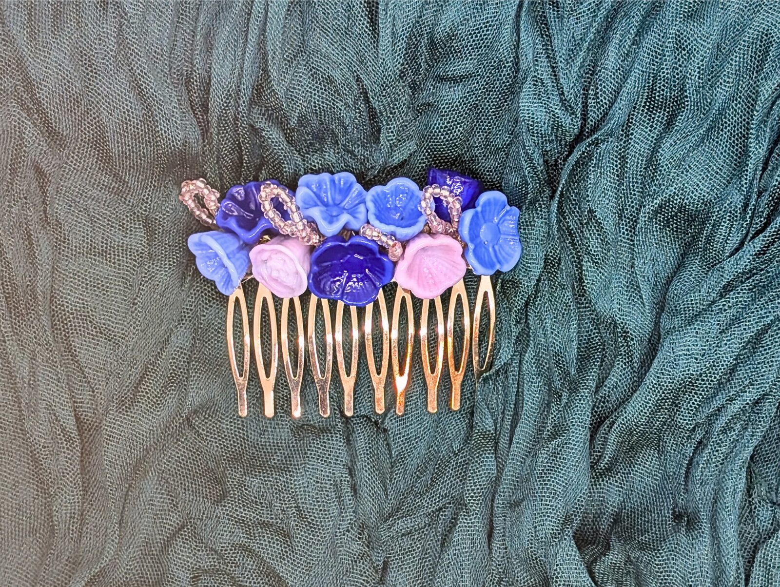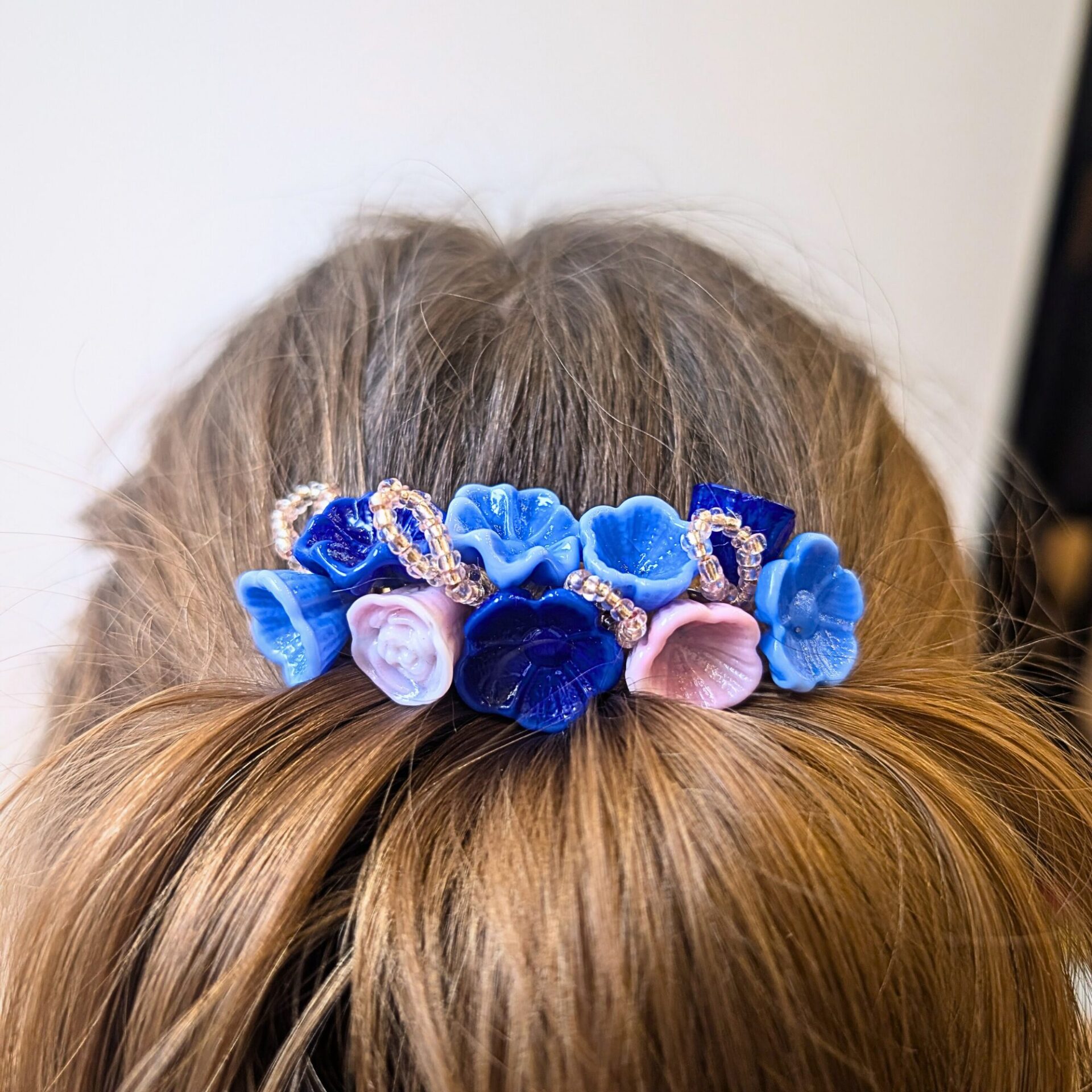 Diese hochwertige Haarspange ist vollständig aus Echtglas gefertigt und besticht durch ihre harmonische Farbkombination aus tiefem Dunkelblau, zartem Babyblau und sanften Rosa-Akzenten. Die kunstvoll gestalteten Blumen-Elemente aus Glas verleihen dem Accessoire eine elegante Tiefe und einen edlen Glanz.