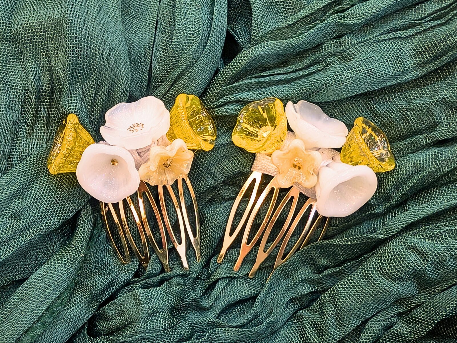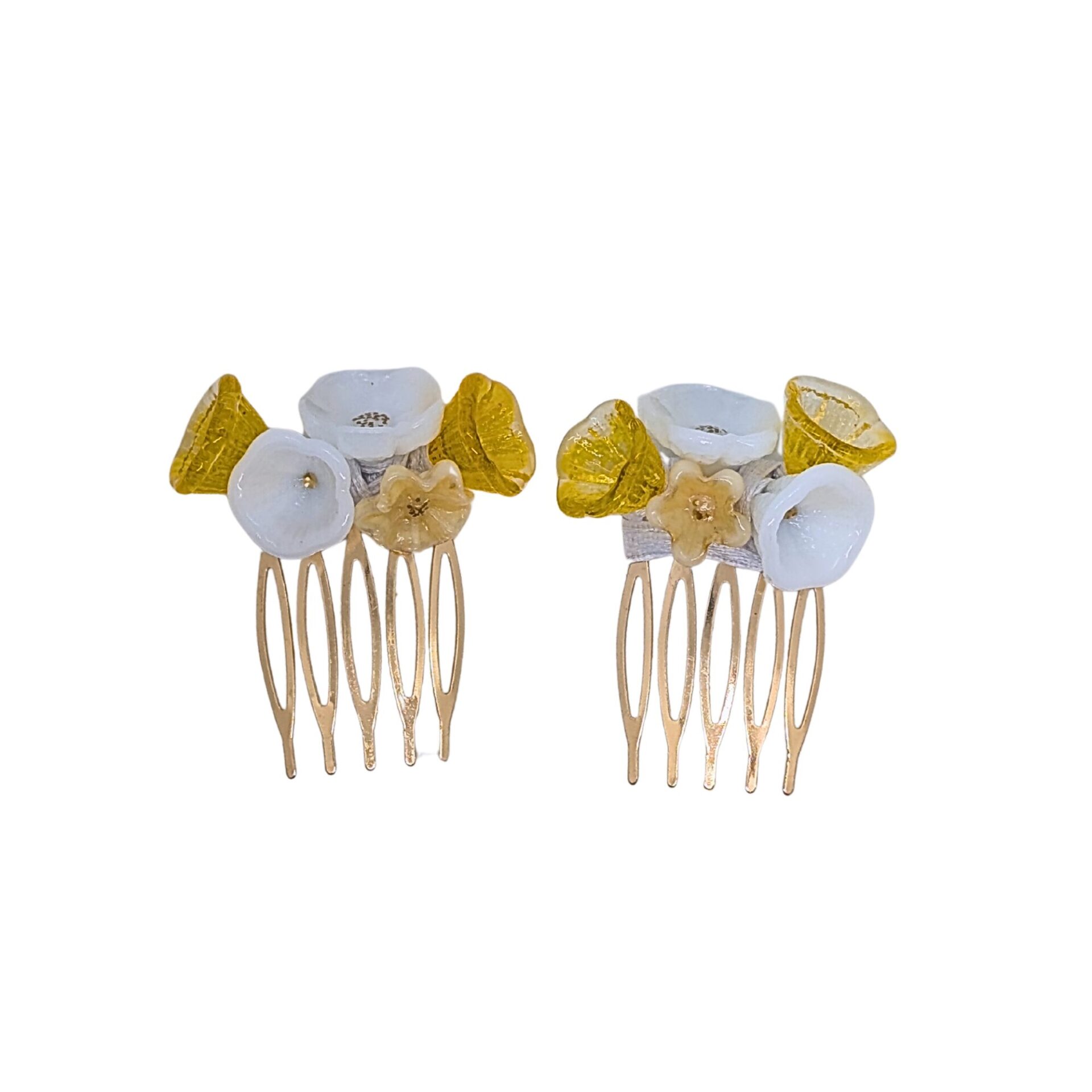 Diese hochwertige Haarspange ist vollständig aus Echtglas gefertigt und überzeugt durch ihre strahlende Farbkombination aus Gelb und Weiß. Die kunstvoll gearbeiteten Blumen-Elemente aus Glas verleihen dem Accessoire eine elegante Leichtigkeit und einen edlen Glanz.