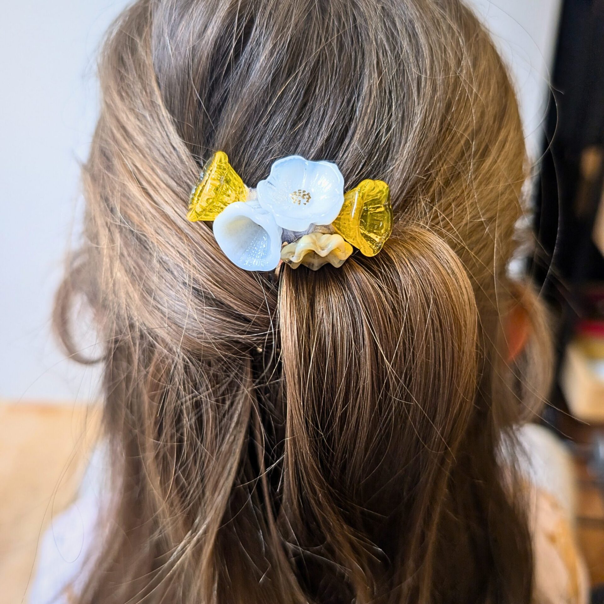 Startseite » Shop » Haarspange Echtglas-gelb weiß