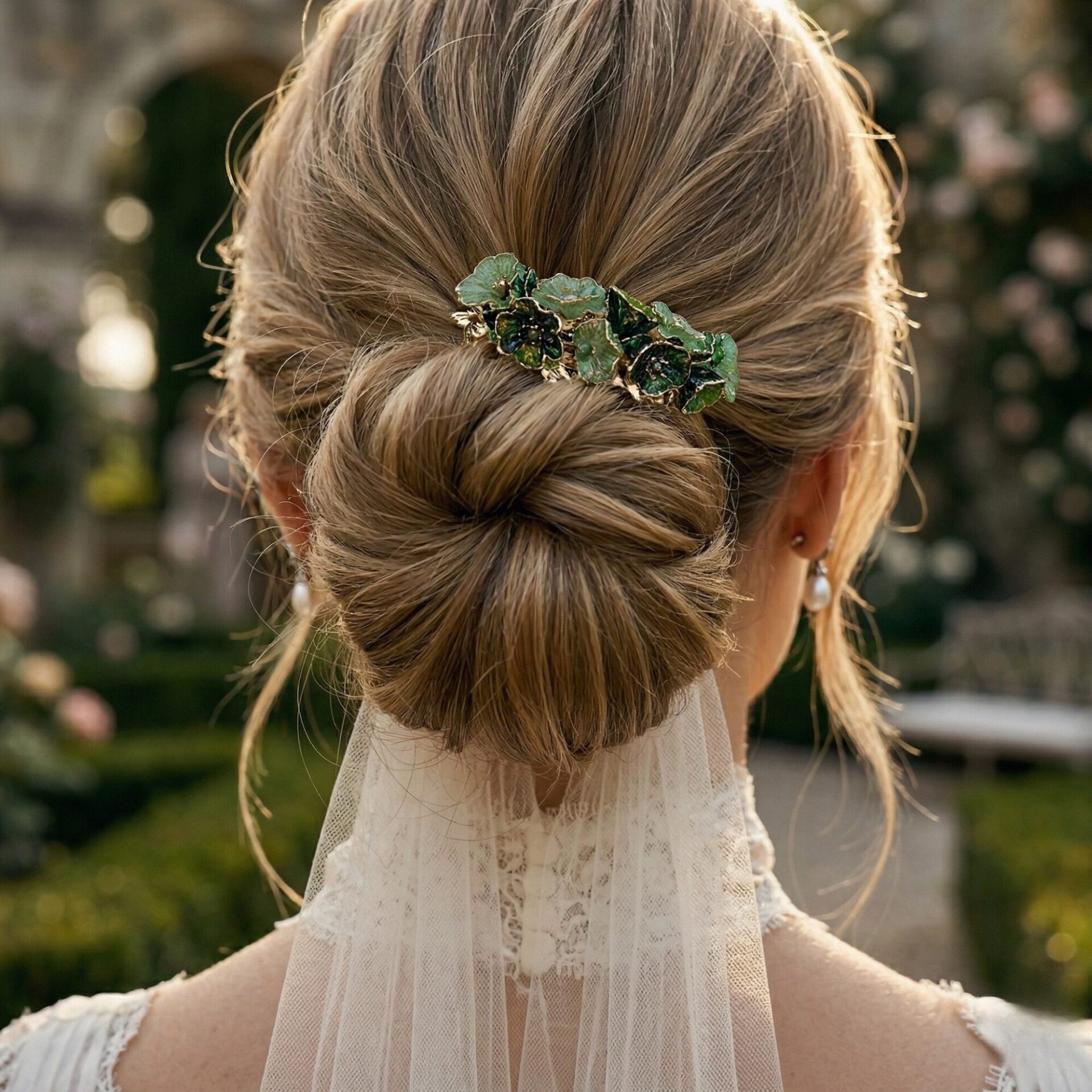 Haarspange aus Echtglas in Grün mit Blumen-Design. Edler Glanz, hochwertige Verarbeitung und sicherer Halt für elegante Frisuren.