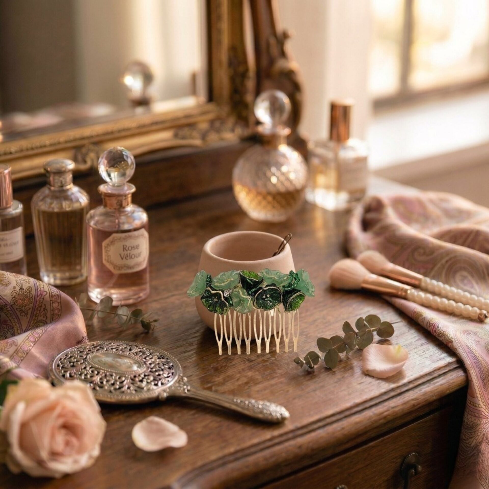 Diese elegante Haarspange ist vollständig aus hochwertigem Echtglas gefertigt und besticht durch ihre edle grüne Farbgebung. Die kunstvoll gestalteten Blumen-Elemente aus Glas verleihen dem Accessoire eine besondere Tiefe und einen stilvollen Glanz.