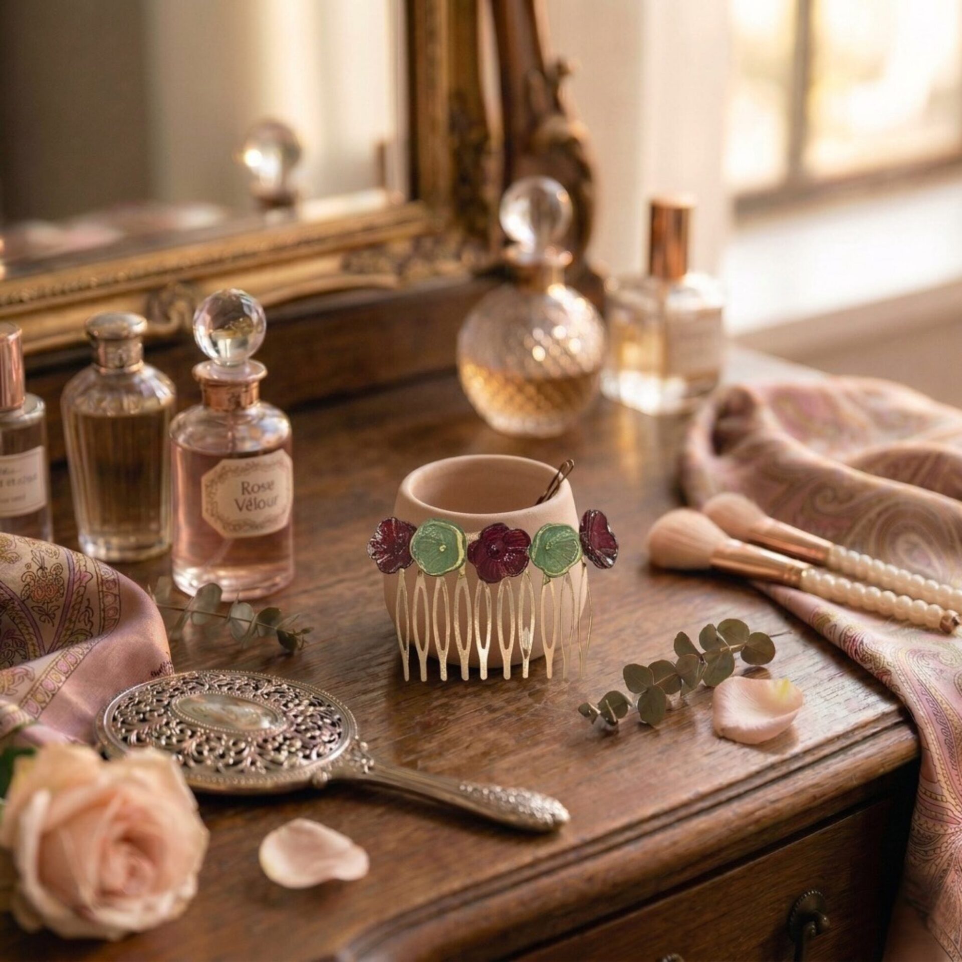 Durch das Echtglas wirkt die Haarspange besonders hochwertig und einzigartig. Die stabilen Zinken sorgen für sicheren Halt und lassen sich einfach ins Haar einstecken – ideal für Hochsteckfrisuren, Dutts oder halb offene Styles.