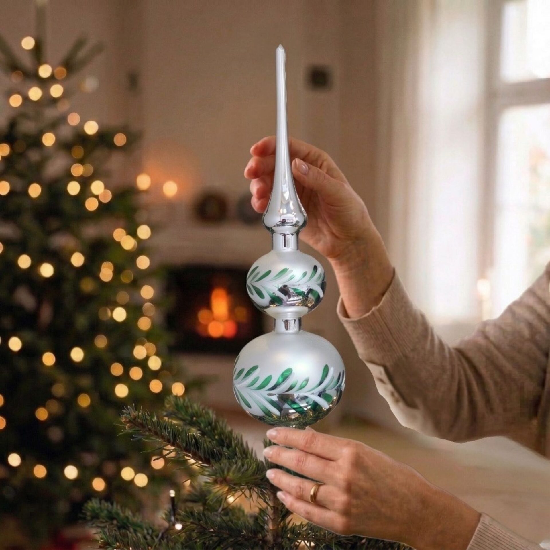 Diese festliche Christbaumspitze vollendet jeden Weihnachtsbaum mit purer Eleganz und feinem Stilgefühl. Die Spitze ist in einem wunderschönen, glänzenden Silber gehalten und in einem zarten, matten Silbergrau. Die Spitze besteht aus zwei wohlgeformten Bäuchen, die ihr eine klassische, zugleich außergewöhnlich anmutige Silhouette verleihen. Ranken mit schimmernden Blättern in Grün und Weiß trenne die Oberfläche in einem Waagerechten Stil und bringen einen Hauch von Natur in den festlichen Glanz des Silbers. Ob einzeln oder in Kombination mit den passenden Kugeln – diese Christbaumspitze setzt einen strahlenden Abschluss und lässt den Baum in festlicher Ruhe und Harmonie erstrahlen. Die Spitze ist 31 cm groß, von Hand verziert und in Deutschland hergestellt. Durch ihre hochwertige Verarbeitung ist sie besonders langlebig und Pflegeleicht. Unser Weihnachtsschmuck ist nur für den Gebrauch im Innenbereich vorgesehen.