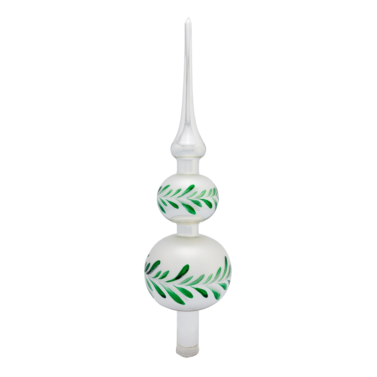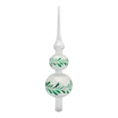 Diese Spitze ist 31cm groß. Sie präsentiert sich in einem strahlendem Silber sowie in einem feinem, mattem Silbergrau. Ihr zwei Glasbäuche sind von wunderschönen Ranken und Mistelzweigen verziert.