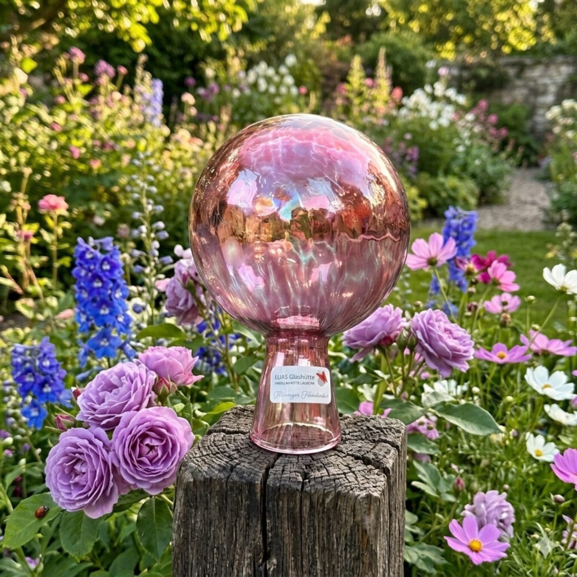Durch ihre kompakte Größe eignet sich die Glaskugel ideal für kleinere Blumenbeete, Pflanzgefäße oder als dekoratives Highlight auf Balkon und Terrasse. Die glänzende Glasoberfläche reflektiert das Licht sanft und sorgt für eine warme, stilvolle Atmosphäre in jeder Gartengestaltung.
