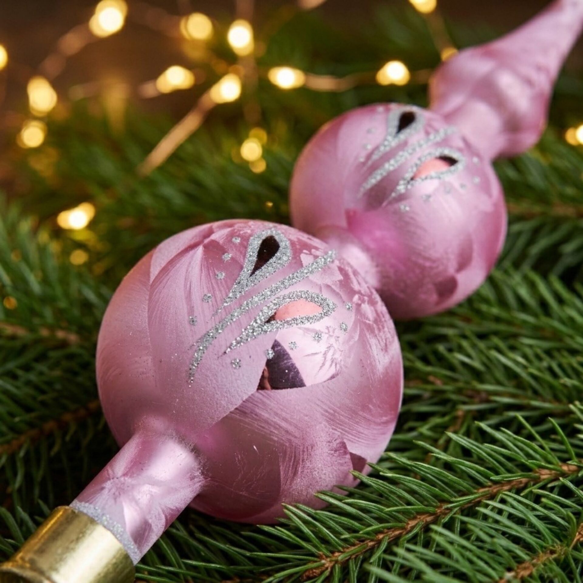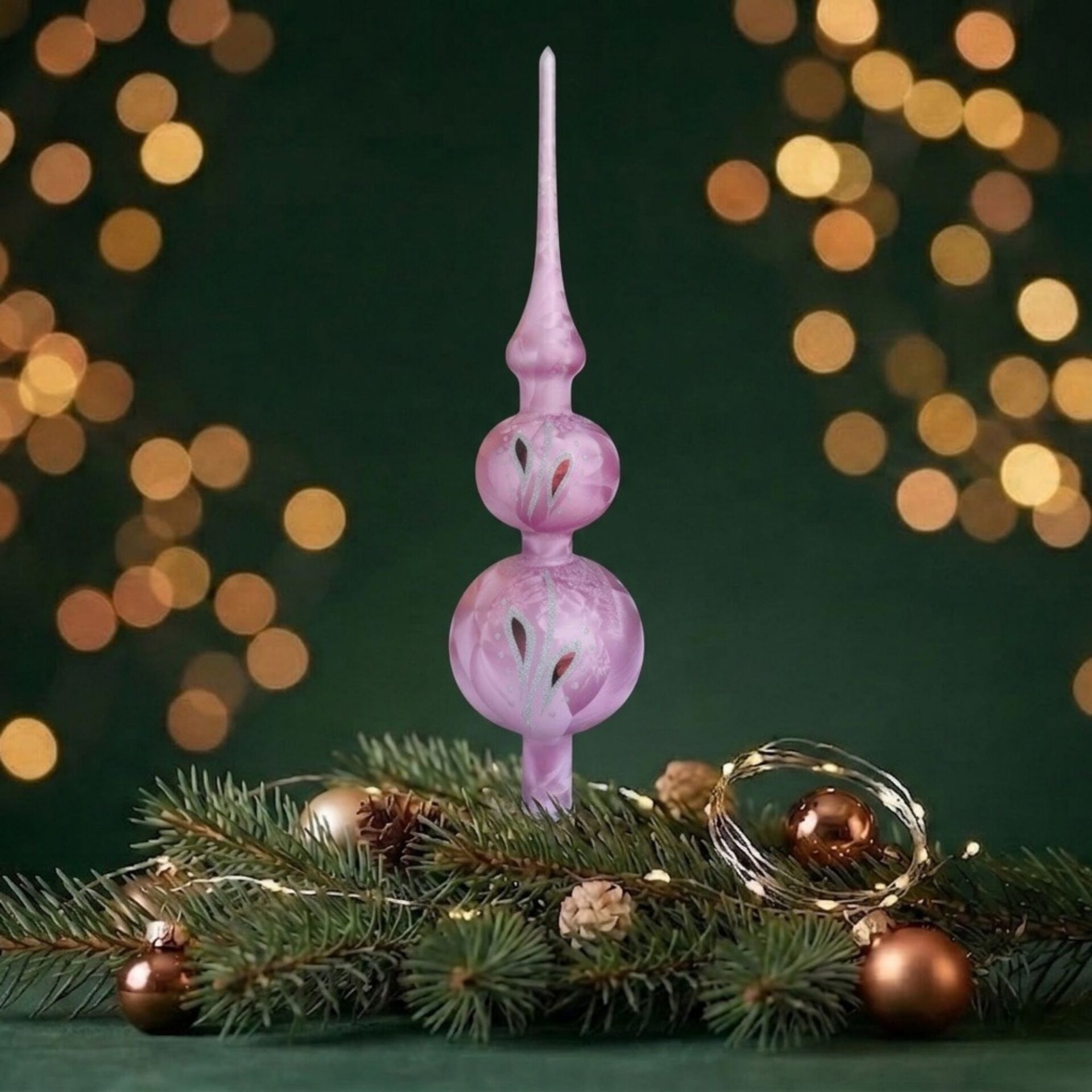 Diese edle Weihnachtsbaumspitze ist das glanzvolle Highlight jeder festlichen Dekoration. Mundgeblasen und von Hand bemalt, vereint sie traditionelle Glasbläserkunst mit zeitloser Eleganz. Die Spitze zeigt sich in einem verspielten, matten Rosaton, geschmückt mit einem kunstvollen Icing-Design und Silber glitzernden Ornamenten, die das Licht festlich reflektieren. Besonders auffällig sind die zwei elegant geformten Bäuche, die der Spitze eine harmonische Silhouette und außergewöhnliche Tiefe verleihen. Links und rechts schmücken tropfenförmige Akzente in glänzendem Rot, eingerahmt von feinem Silberglitter – ein faszinierendes Zusammenspiel aus Glanz und Struktur. Die Spitze ist 31 cm groß, von Hand verziert und in Deutschland hergestellt. Durch ihre hochwertige Verarbeitung ist sie besonders langlebig und Pflegeleicht. Unser Weihnachtsschmuck ist nur für den Gebrauch im Innenbereich vorgesehen.